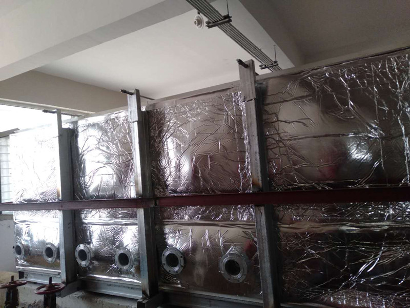 玻璃鋼無內件外加固保溫水箱設計內加強結構型式,水箱箱體為型板裝配氬弧焊接而成,型板拼裝交叉部位設計雙向加強聯(lián)桿。箱體側板與底板間設置垂直加固柱,水箱側板四周外每層相鄰。型板間設置水平加強板,加強材料同箱體材料。水箱底部設置鍍鋅槽鋼支架。水箱附件有檢查孔、內外扶梯、工藝管口、材料均為不銹鋼,水箱工藝管口按用戶提供的圖樣設計。